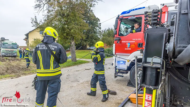 ALKOVEN (OÖ): Bei der Heimfahrt vom vorangehenden Personenrettungseinsatz am Nachmittag des 7. Oktober 2022 kam die Besatzung des Kleinrüstfahrzeuges der Feuerwehr Polsing gegen 15.40 Uhr bei einem in Aham festgefahrenen 4-Achs-Betonmischers vorbei.
