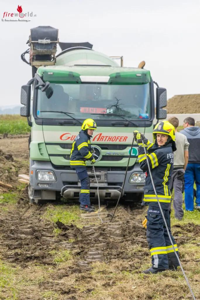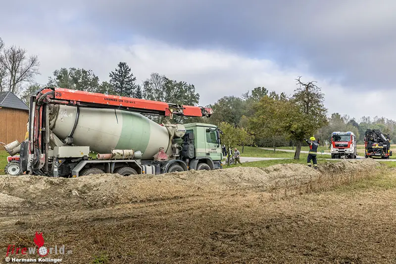 Oö: Feststeckender 4-Achs-Betonmischer und Ölspur im Bereich von Alkoven