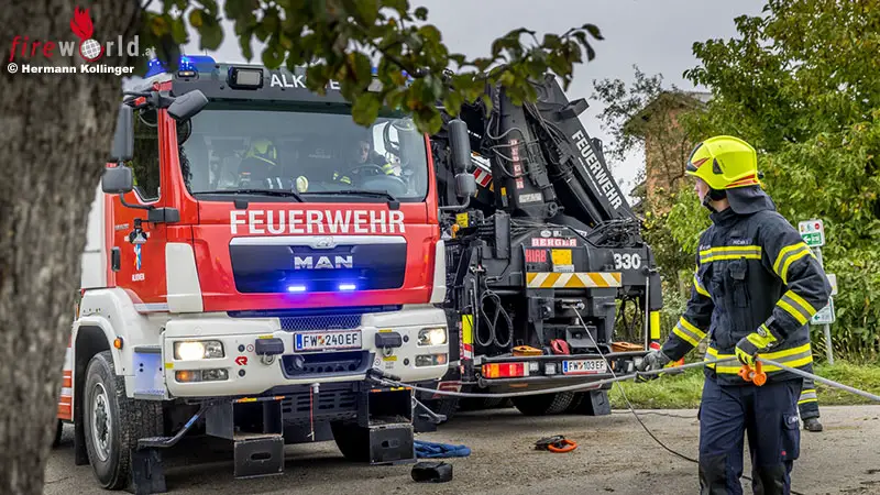 Bergungsversuche mit einem Traktor waren zuvor gescheitert. Über Funk verständigten die Polsinger Kameraden die Feuerwehr Alkoven, deren Mitglieder gerade von der Personenrettung am Donaudamm eingerückt waren. Das Kran- sowie das Rüstlöschfahrzeug rückten daraufhin zum Bergungseinsatz aus.