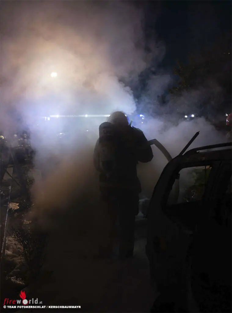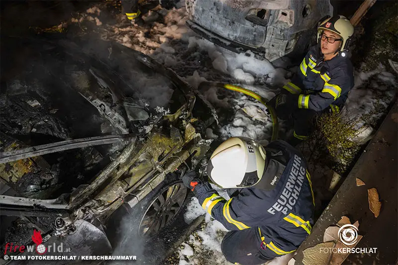 LINZ (OÖ): Kurz nach 18 Uhr sind die Feuerwehr Pichling und die Berufsfeuerwehr Linz am 25. Oktober 2022 zu einem Fahrzeugbrand im Stadtteil Pichling alarmiert worden. Zwischen zwei Häusern war ein Auto in Flammen aufgegangen und hat auf ein weiteres Fahrzeug übergegriffen.