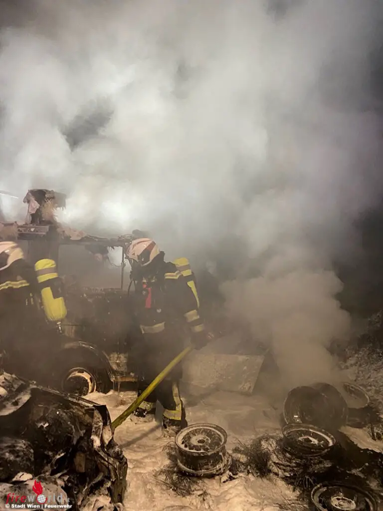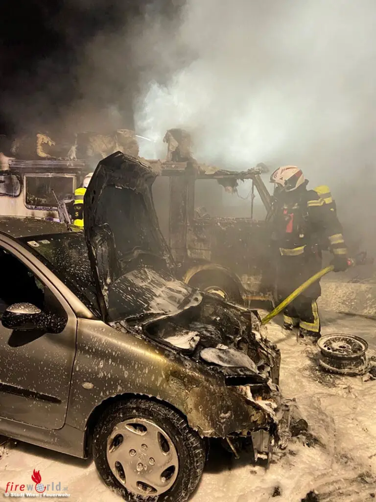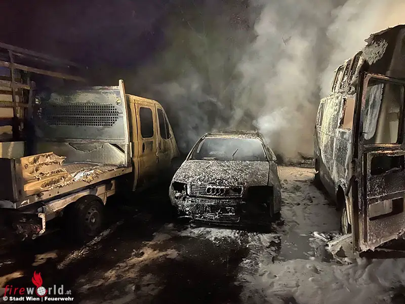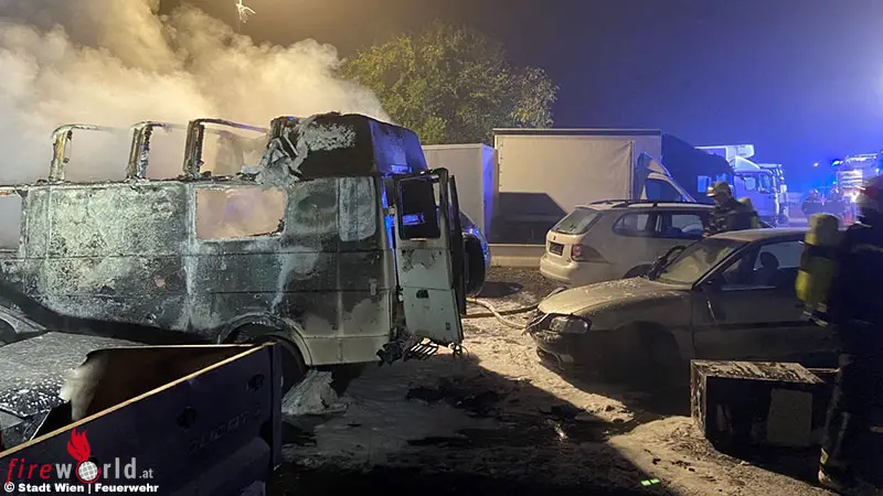 Wien: Brand von vier Pkw, einem Wohnmobil, Pritschenwagen und Klein-Lkw im 11. Bezirk