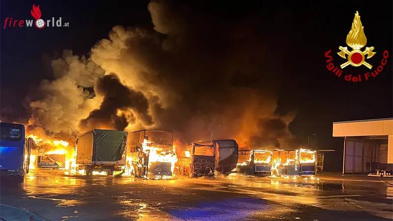 Italien: 25 Busse, Müllsammelfahrzeuge und Lkw brannten vor Garage in Nettuno in Rom