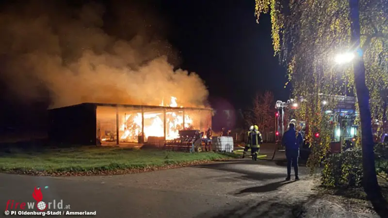 DETERN | APERN (DEUTSCHLAND): Am Freitag, 4. November 2022, bricht auf einem landwirtschaftlichen Anwesen im Grenzbereich der Samtgemeinde Jümme in Detern und der Gemeinde Apen gegen 22:07 Uhr ein Feuer in einem Unterstand für landwirtschaftliche Geräte aus.