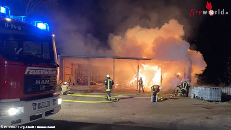 DETERN | APERN (DEUTSCHLAND): Am Freitag, 4. November 2022, bricht auf einem landwirtschaftlichen Anwesen im Grenzbereich der Samtgemeinde Jümme in Detern und der Gemeinde Apen gegen 22:07 Uhr ein Feuer in einem Unterstand für landwirtschaftliche Geräte aus.