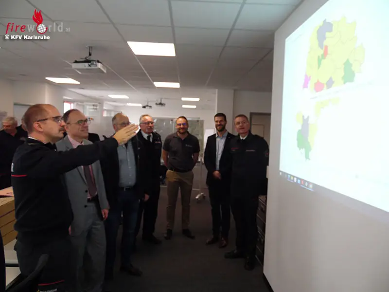 „Wir haben für die beteiligten Feuerwehren 1.200 Einsatzlagen vorbereitet und spielen diese an die örtlichen Führungshäuser zur fiktiven Abarbeitung ein“, berichtet Kreisbrandmeister Jürgen Bordt den Gästen der Übung im Gebäude des DRK Kreisverbandes im Industriegebiet Am Mantel in Bruchsal. Bordt konnte den Ersten Landesbeamten Knut Bühler aus dem Landratsamt Karlsruhe, den Ersten Bürgermeister Andreas Glaser Bruchsal, Leitender Branddirektor Florian Geldner von der Feuerwehr Karlsruhe, Daniel Schneider, Geschäftsführer des DRK Kreisverbandes Karlsruhe, den Leiter der Integrierten Leistelle Stefan Sebold und den Vorsitzenden des Kreisfeuerwehrverbandes Eckhard Helms im Stabsraum begrüßen.