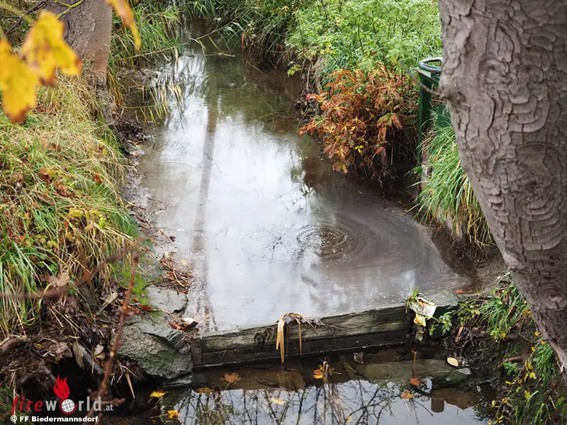 BIEDERMANNSDORF (NÖ): Am Vormittag des 16. November 2022 verständigte ein aufmerksamer Spaziergänger die Feuerwehr, da ein massiver Ölfilm den Hochleitenbach bedeckte.