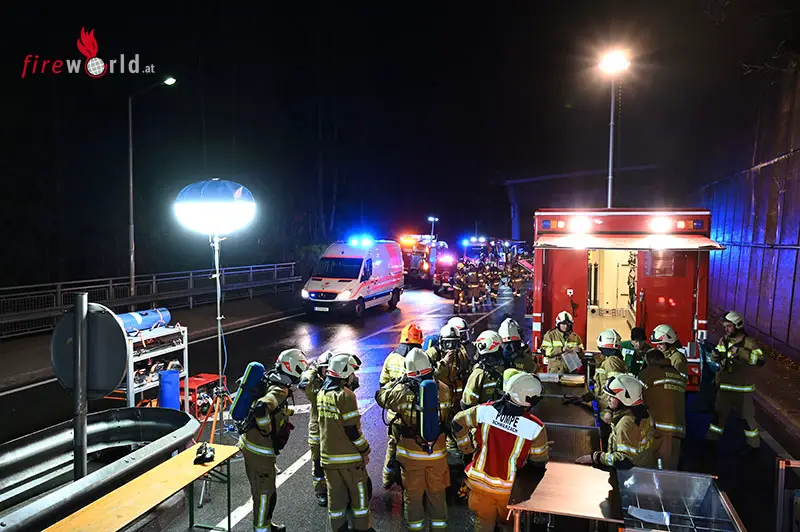 DORFGASTEIN (SBG): Etwa 100 Einsatzkräfte von Feuerwehr, Rotem Kreuz und Land Salzburg beteiligten sich am Freitag Abend, 18. November 2022, an einer bezirksübergreifenden Alarmübung im Klammtunnel. Angenommen wurde ein Lkw-Brand in der Pannenniesche, der zu einer Verrauchung der Tunnelröhre führte, wobei sich noch mehrere Personen im Tunnel befanden.