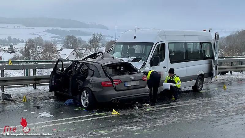 Auf der Talbrücke kam er anscheinend aufgrund von Straßenglätte ins Schleudern und geriet auf die Gegenfahrbahn. Dort stieß der Audi mit der Beifahrerseite gegen die Front eines entgegenkommenden Kleinbusses. Der Audi-Fahrer verstarb noch an der Unfallstelle. Ein 17-jähriger Mitfahrer in dem Audi wurde so schwer verletzt, dass er in Lebensgefahr schwebt und mit dem Rettungshubschrauber in eine Klinik geflogen werden musste.