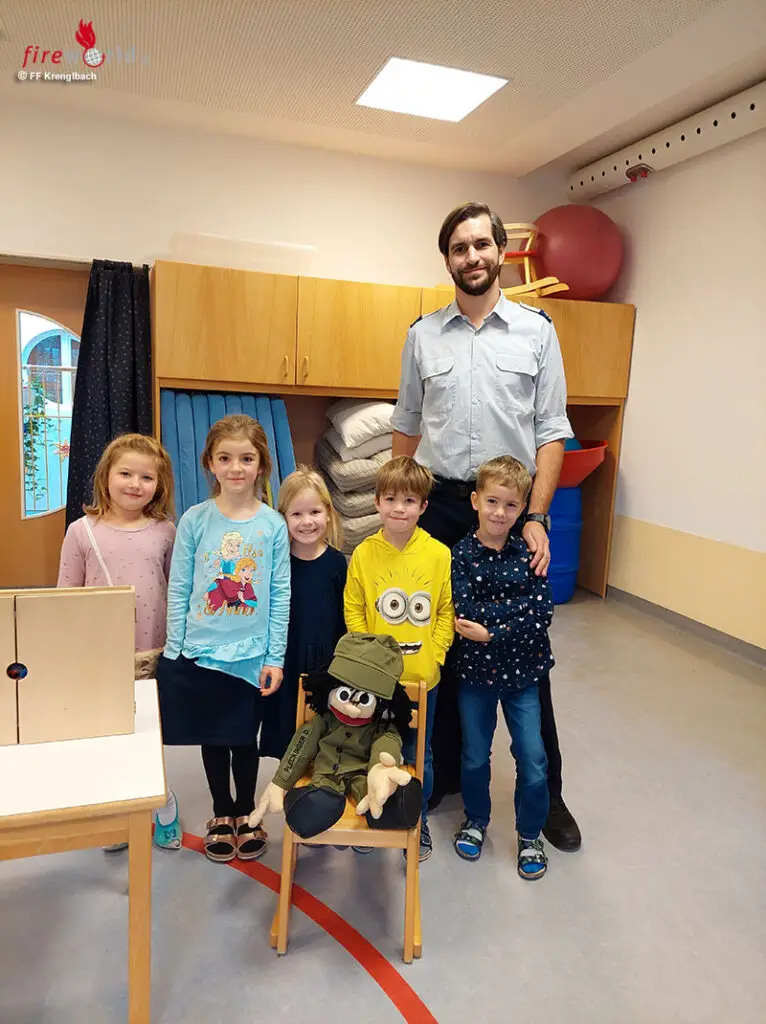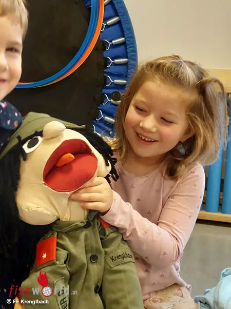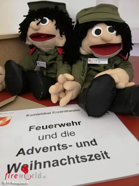Bereits zum zweiten Mal wurde im Kindergarten hierfür ein japanisches Erzähltheater – genannt Kamishibai – eingesetzt. Bei dieser Erzählform werden die Worte des Erzählers mit Bildkarten in einem speziellen Rahmen gestützt. Dies fördert ein aktives Mitarbeiten der Kinder und hilft, das Erzählte auch zu verankern. Die beiden Handpuppen Lösch-Nick und Fire-Joe, die von der Mutter eines Kameraden der FF Krenglbach in liebevoller Handarbeit selbst hergestellt wurden, unterstützen dabei die Erzähler. Abgerundet wird das Erzähltheater von diversen Experimenten mit echten Kerzen, Sternspritzern und Tortenfeuerwerk.