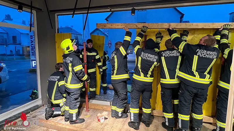 Das durch einen demolierten Heizkörper ausgelaufene Wasser musste man mit einem Wassersauger beseitigen. Nach insgesamt drei Stunden konnte das Schaufenster abgestützt und mit Schaltafeln verschlossen werden.