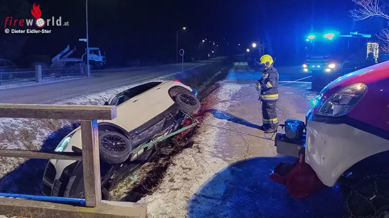Eine Pkw-Lenkerin war aus unbekannter Ursache mit ihrem Fahrzeug von der der Fahrbahn abgekommen. Schlussendlich landetet das Fahrzeug auf dem Dach im Pfarrbach. Die Lenkerin wurde dabei nicht verletzt.