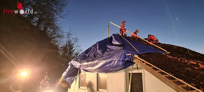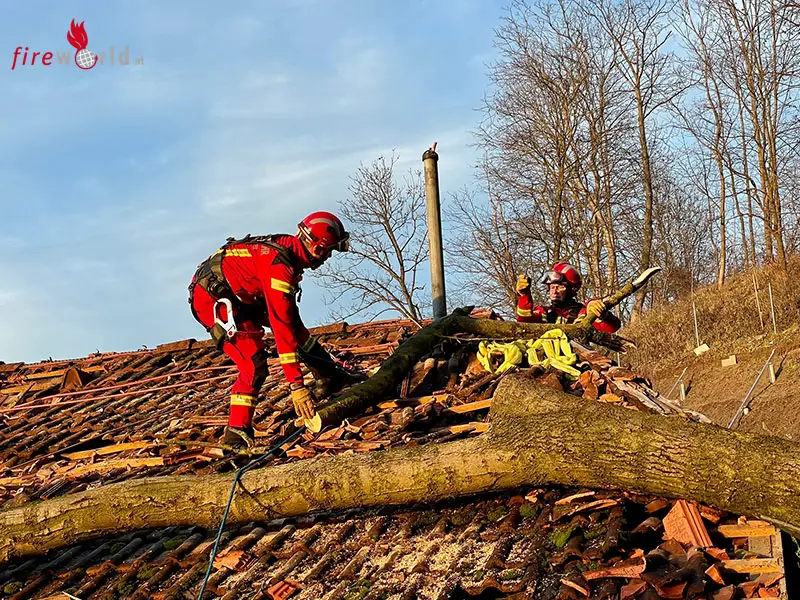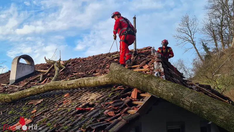 Die Einsatzkräfte haben die Esche entfernt und in einem langwierigen Einsatz das Dach provisorisch mit Planen abgedichtet, damit Regenwasser nicht noch mehr Schaden anrichtet. Von der Freiwilligen Feuerwehr Steyregg standen 25 Kräfte im Einsatz und vom Stützpunkt Schweinbach rückten acht Höhenretter aus.