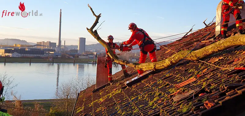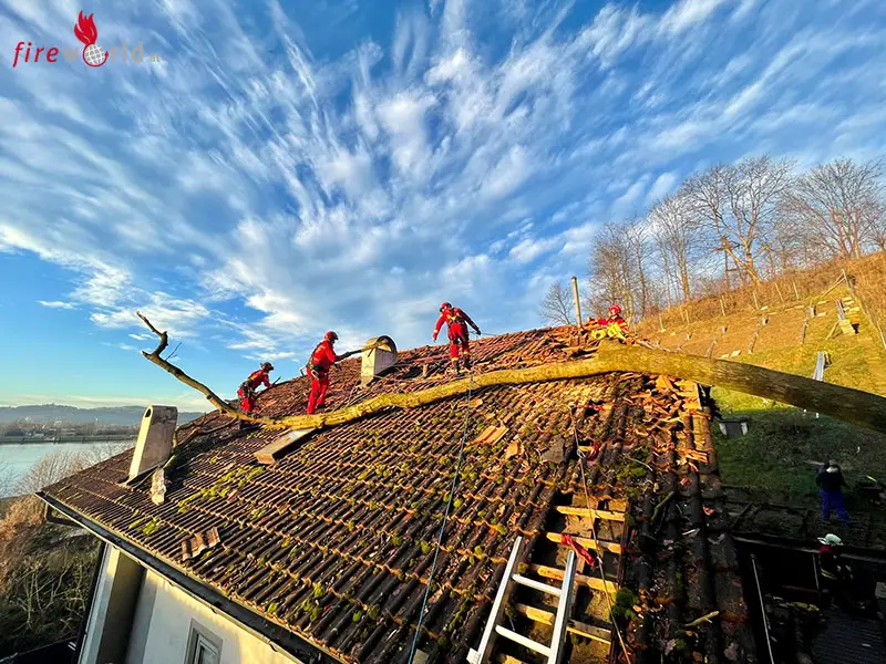 STEYREGG (OÖ): Am ersten Weihnachtsfeiertag, 25. Dezember 2022, ist eine Esche auf ein Wohnhaus in Windegg (Gemeinde Steyregg) gestürzt und hat das Dach und die Stromleitung schwer beschädigt. Für die Freiwillige Feuerwehr Steyregg und die Höhenretter vom Feuerwehrstützpunkt Schweinbach begann ein langwieriger Einsatz.