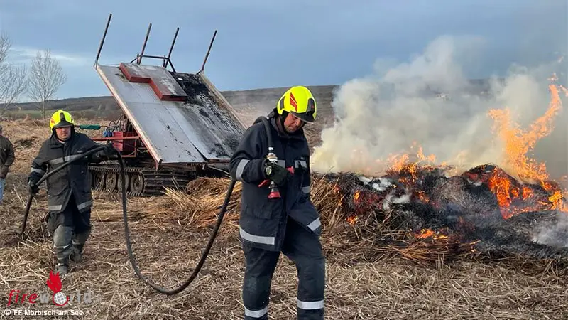 MÖRBISCH AM SEE (BGLD): Um 08:11 Uhr wurden die Mitglieder der FF-Mörbisch/See am Sonntag, dem 15. Jänner 2023, zu einem Brandeinsatz alarmiert. Bei Arbeiten auf einem Schilflagerplatz war eine beladene Schilferntemaschine in Brand geraten.