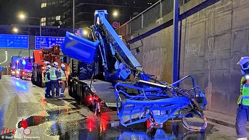 Wien: Lkw mit geladener Arbeitsbühne bleibt an Stadionbrücke hängen
