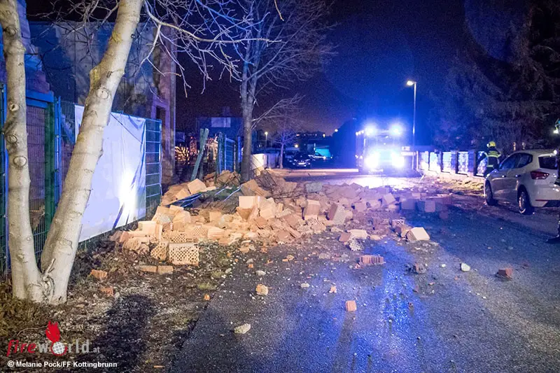 Nö: Mauereinsturz nach Sturm neben Feuerwehrhaus in Kottingbrunn