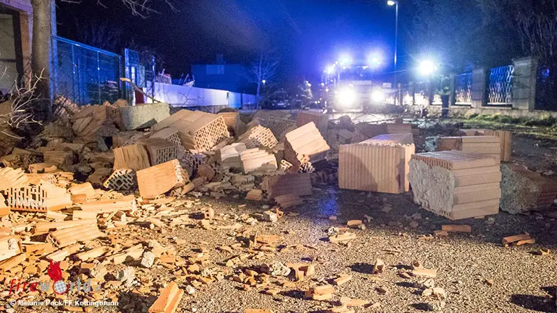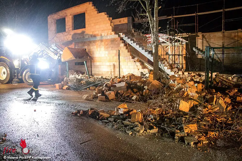 Vor Ort fand der Einsatzleiter eine Straße der Verwüstung vor. Eine ca. 250 m² große Mauer eines Rohbaus stürzte um und landete auf der Fahrbahn. Dabei wurde ein parkendes Fahrzeug beschädigt. Auch der Grundstückszaun wurde dabei in Mitleidenschaft gezogen. Bei der Ausrückemeldung wurde der Einsatzleiter informiert, dass unklar ist ob Personen verschüttet wurden.