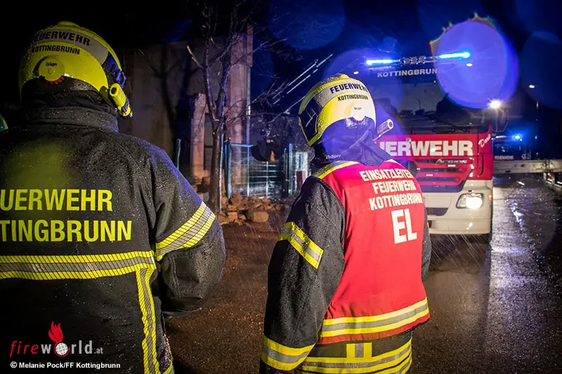 So wurde auch die Freiwillige Feuerwehr Kottingbrunn kurz vor 19 Uhr zu einem Sturmschaden alarmiert. Das Alarmstichwort lautete „Gebäudeeinsturz“, weshalb aufgrund der Alarmstufe mittels Sirene alarmiert wurde. Der Anfahrtsweg war für die Feuerwehr nicht allzu lang, da sich der Einsatzort direkt neben dem Feuerwehrhaus befand.