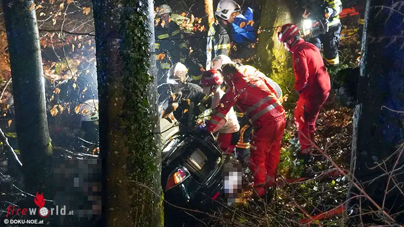 Nö: Pkw mit fünf Inassen bei St. Leonhard am Walde in Waldstück gestürzt → eine Person eingeklemmt