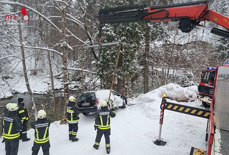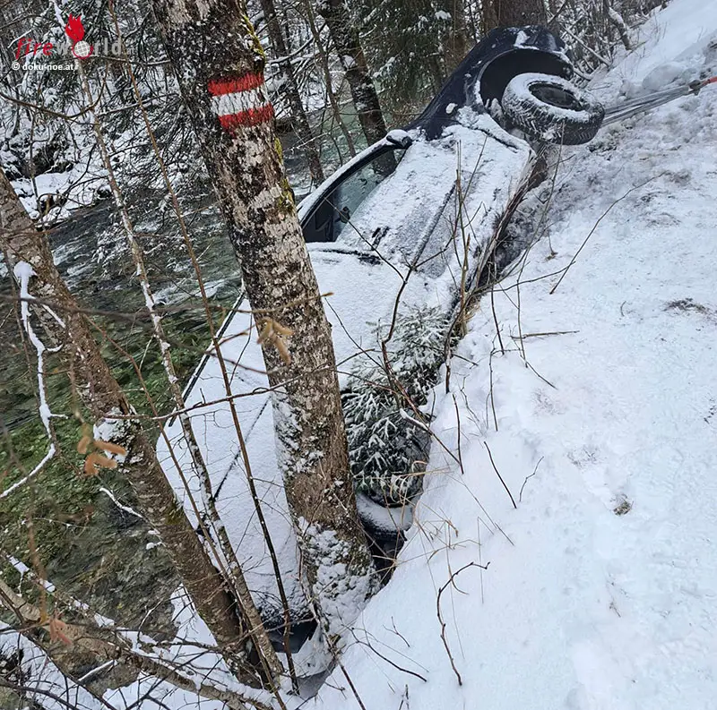 LUNZ AM SEE (NÖ): In Hinterleiten nahe Lunz am See kam am Nachmittag des 26. Februar 2023 ein Pkw von der Straße ab und stürzte über eine Böschung wo der Pkw in Seitenlage schlussendlich zum Stillstand kam.