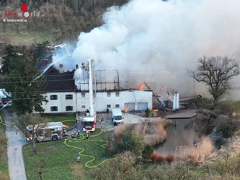 WIESELBURG (NÖ): Per 17 Uhr des 28. Februar 2023 kämpfen 10 Feuerwehren aus zwei Bezirken in Wieselburg gegen einen Großbrand eines landwirtschaftlichen Objekts an.