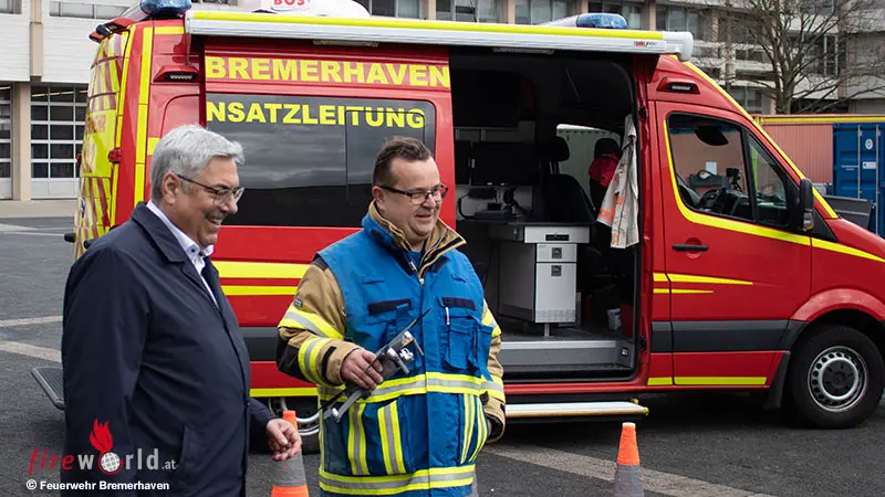 BREMERHAVEN (DEUTSCHLAND): Die Feuerwehr Bremerhaven verfügt ab sofort über eine eigene Drohneneinheit. Der Dezernent der Feuerwehr, Oberbürgermeister Melf Grantz, die Teamleitung Einsatzorganisation bei der Feuerwehr, Tim Bergmann und der Leiter der Drohneneinheit, Daniel Solinski, haben am 23. März 2023 die Drohneneinheit der Öffentlichkeit über die Medienvertreterinnen und Medienvertreter vorgestellt.