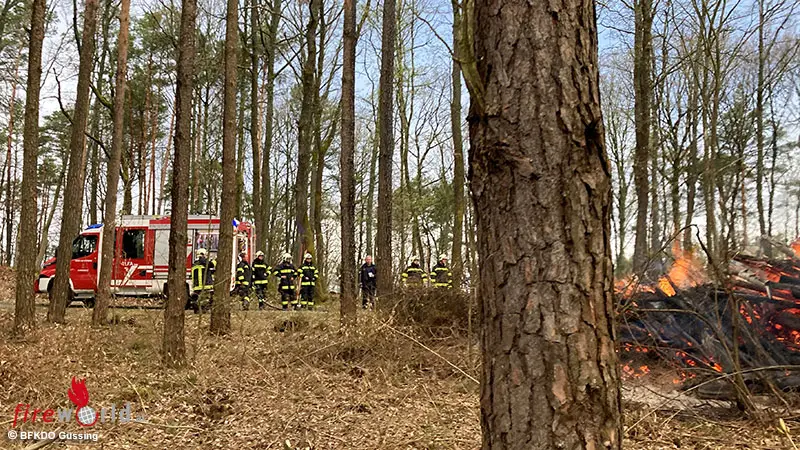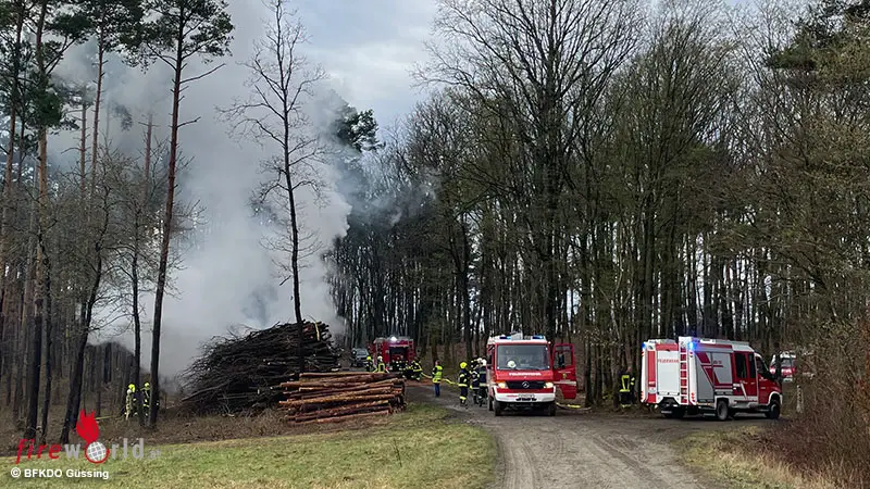 Ein großer Holzstoß geriet in Brand und das Feuer drohte auf den Wald überzugreifen. Bewohner bemerkten die Rauchentwicklung im abgelegenen Waldstück und verständigten die Einsatzkräfte.