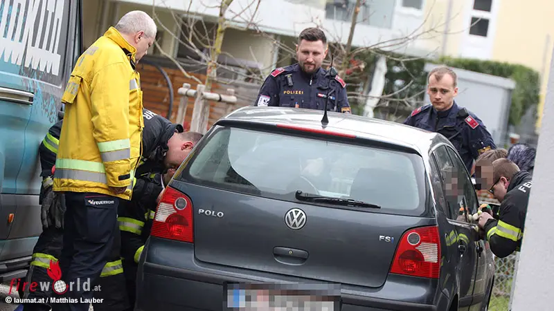 Die Einsatzkräfte wurden zu einem in einer Hauseinfahrt in der Welser Innenstadt abgestellten Fahrzeug alarmiert. Ein junger Bub wurde versehentlich im Fahrzeug eingeschlossen. Da aufgrund der vorherschenden Temperaturen keine ganz akute Gefährdung vorlag, wurde versucht, den PKW möchlichst beschädigungsfrei zu öffnen. Die Einsatzkräfte der Feuerwehr bemühten sich das Auto zu öffnen, erste Versuche scheiterten jedoch. Der verständigte Mechaniker eines Automobilclubs konnte rasch eine der Autotüren öffnen. Der eingeschlossene junge Bub wurde während der Einsatzdauer von der Mutter und den Kräften der Feuerwehr mittels Plüschtier bei Laune gehalten und überstand den Vorfall unverletzt. Die Linzer Straße war für die Dauer des Einsatzes gesperrt.