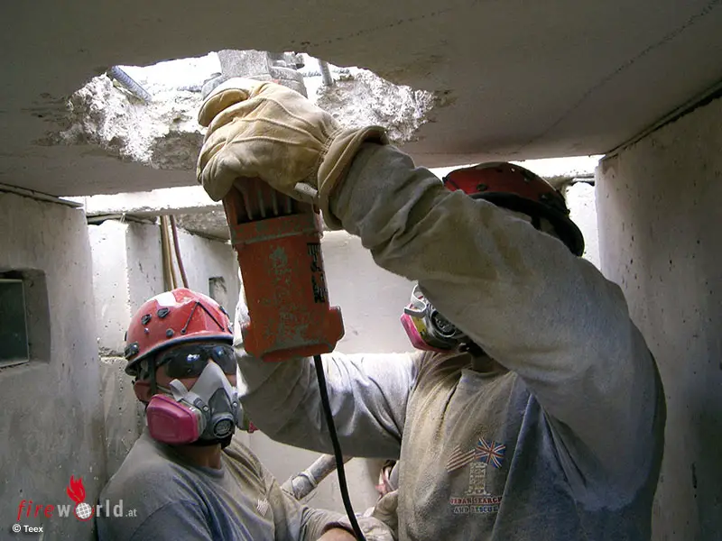 Dave Phillips, Teamleiter der Feuerwehr von Lincolnshire in Großbritannien, hat gerade mit einer rund 50 Kilogramm schweren, Schmutzwasser spritzenden Kettensäge einen Betonblock zerteilt. Zufrieden wischt er sich Schweiß und Schmutz aus dem Gesicht und sagt: „Das Training hier ist so lebensnah wie nur möglich, aber es ist beruhigend zu wissen, dass die Decke nicht über einem zusammenkrachen kann.“ Der Engländer ist bereits zum zweiten Mal hier – diesmal hat er den Kurs „Fortgeschrittener struktureller Kollaps 5“ belegt. Er will üben, wie man durch stahlverstärkte Betonwände in einsturzgefährdete Gebäude dringt, ohne von der Wucht einer berstenden Stahlstange „in zwei Teile geschnitten zu werden“, wie er es ausdrückt.
