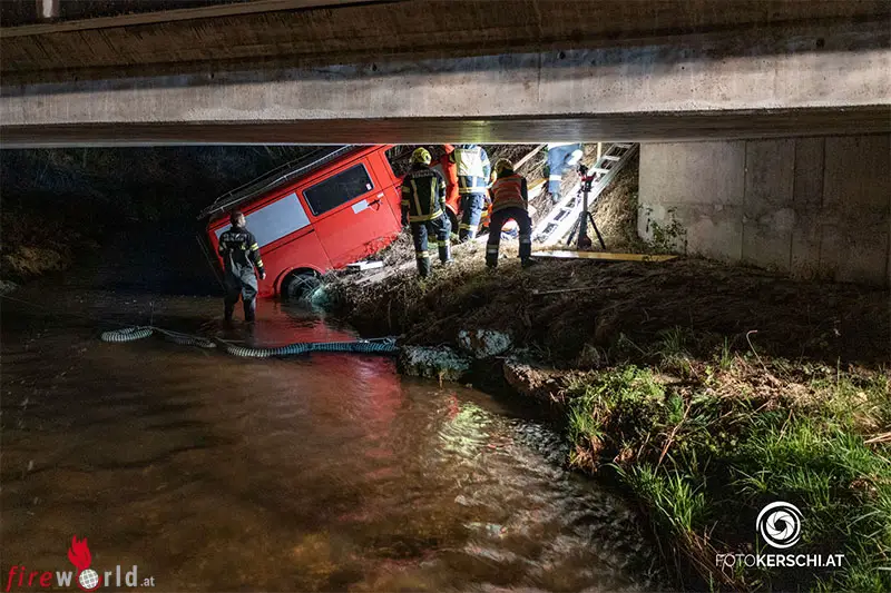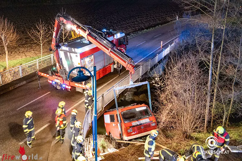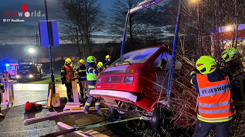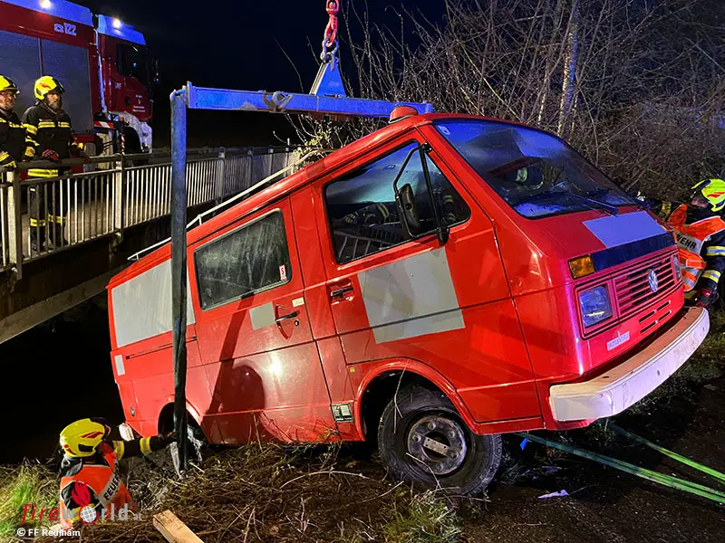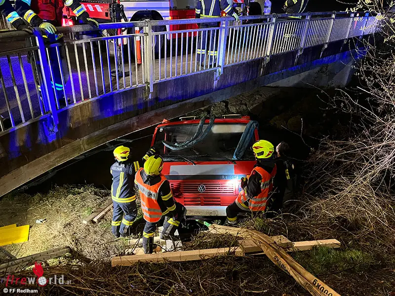 REDLHAM (OÖ): Am Freitag, dem 31. März 2023, wurde die Freiwillige Feuerwehr Redlham um 04:54 Uhr zu einer Fahrzeugbergung in der Ortschaft Einwarting (Gemeinde Redlham) alarmiert. Ein Fahrzeug war aus unbekannter Ursache über eine steile Böschung direkt unter die Brücke des Lehbach gerollt und hat sich dort verkeilt.