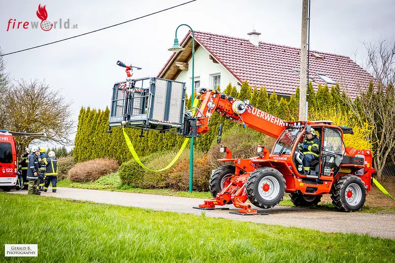 Gleichzeitig wurden mehrere Rohre zum Schutz der Nachbarobjekte und für den unmittelbaren Löscheinsatz von außen in Stellung gebracht. Zudem wurde eine Zubringerleitung von einem Hydranten mit einer Relaispumpe aufgebaut, sodass ein umfassender Löschangriff möglich war. Über den Teleskoplader wurde mittels Wenderohr die Brandbekämpfung des Dachstuhls komplettiert.