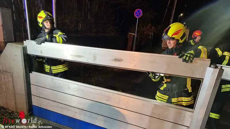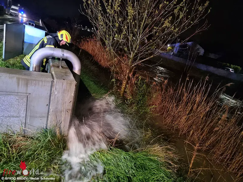 Gegen ca. 23 Uhr wurde der Hochwasservoralarm ausgelöst und mehrere Feuerwehren rückten zu Kontrollfahrten aus. Zuvor waren auch schon Polizeistreifen im Auftrag der Behörde unterwegs. Da sich die Lage weiter zuspitzte veranlasste die Bezirkshauptmannschaft Baden, dass sicherheitshalber der mobile Hochwasserschutz in Tribuswinkel durch die Freiwillige Feuerwehr aufgebaut werden soll.