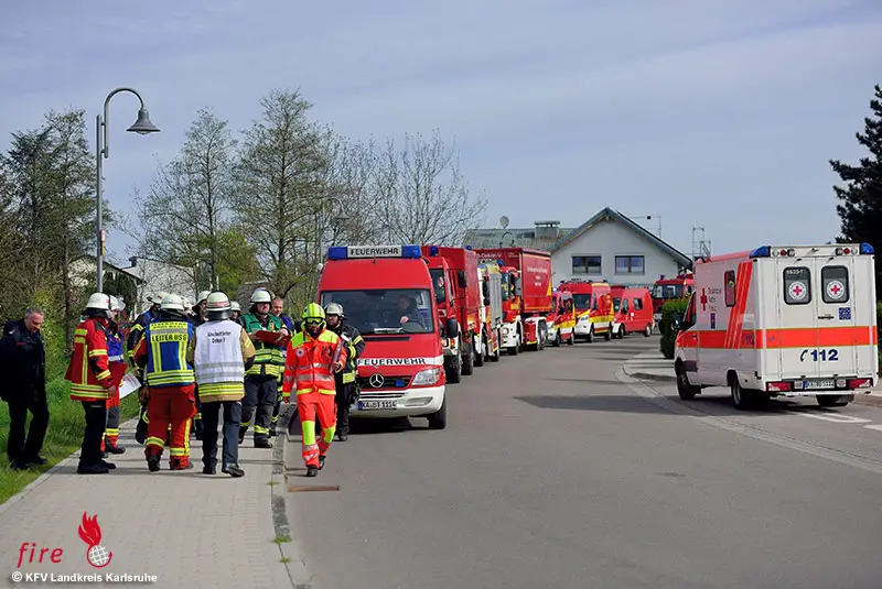 STUTENSEE (DEUTSCHLAND): Ein Großaufgebot an Fahrzeugen und Personal des Bevölkerungsschutzes wies am Samstagvormittag, 15. April 2023, auf dem Festplatz im Stutenseer Stadtteil Blankenloch auf ein größeres Unglückereignis hin. Es war allerdings nur eine sehr realistisch vorbereitete Großübung.