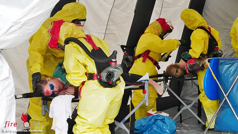 Die Entscheidung des Notarztes erforderte durch die Integrierte Leitstelle Karlsruhe die Alarmierung der DekonV 50 Einheit Karlsruhe-Land, bestehend aus ca. 80 Einsatzkräften der Unteren Katastrophenschutzbehörde des Landratsamtes Karlsruhe, den Feuerwehren Bretten, Bruchsal, Gaggenau und Karlsruhe, der LNA Gruppe des Rettungsdienstbereiches Karlsruhe sowie der 5. Einsatzeinheit Ost des DRK Kreisverbands Karlsruhe zum Aufbau eines Dekontaminationsplatzes für liegende und gehfähige Patienten.