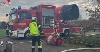 Parallel zur Brandbekämpfung brachten weitere Einsatzkräfte die Drehleiter in Stellung. Hierüber wurde dann ein Streifen der Fassade geöffnet um die darunter liegenden Glutnester abzulöschen. Abschließend erfolgte eine Kontrolle mit der Wärmebildkamera. Auch das Gebäude wurde begangen und auf mögliche Auswirkungen durch den Brand kontrolliert. Hier waren keine weiteren Maßnahmen seitens der Feuerwehr erforderlich.