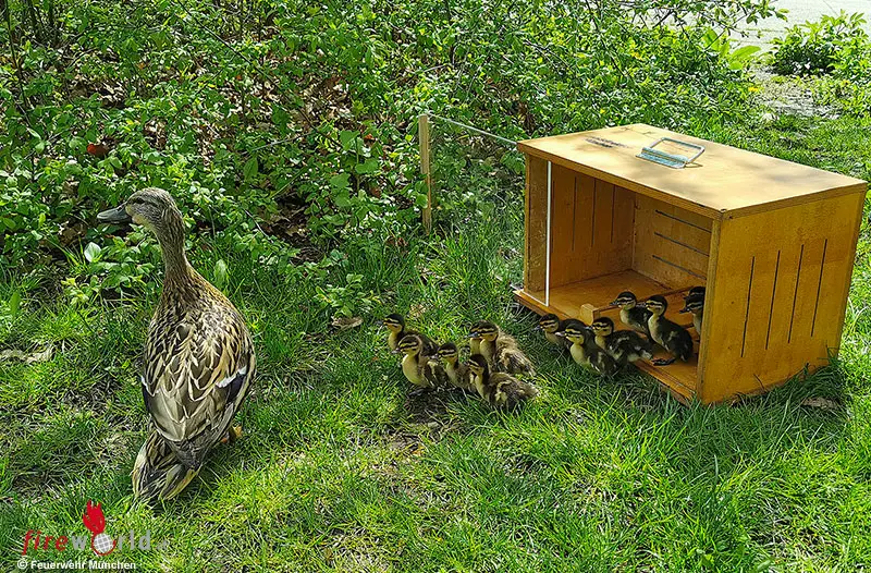 Das Ergebnis gab ihrer Einschätzung recht, denn insgesamt 13 Küken scharten sich nach dem Schlüpfen in ihrem Nest. Das Problem war nun aber, dass dieser vor Räubern geschützte Platz ein Gefängnis für die Kleinen war. Die Klaf-Besatzung konnte nach ihrer Lageeinschätzung mit geringem Aufwand die Enten-Groß-Familie einfangen. Unweit ihres Geburtsortes wurden die Tiere auch gleich wieder am Ramses-See in die Freiheit entlassen.