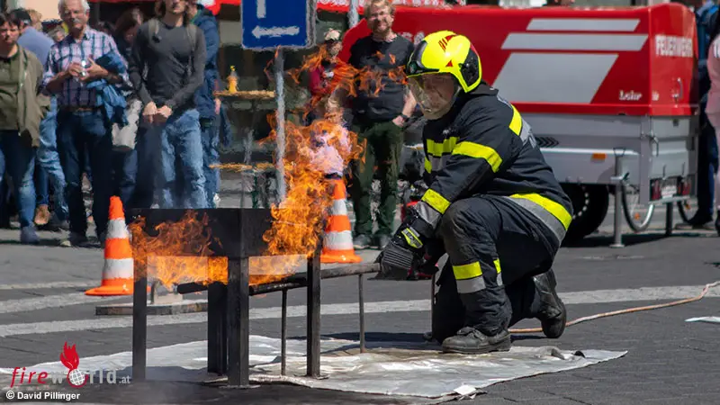 Als Abschluss simulierte HBI Jürgen Happer, Kommandant der Feuerwehr Kaindorf, einen Fettbrand. ABI d.F. Ing. Gottfried Roiko, Kommandant der Stadtfeuerwehr, machte dabei in seiner Moderation auf die Gefahren eines solchen aufmerksam und was es dabei zu beachten gilt beziehungsweise über die richtige Vorgehensweise. Denn auf keinen Fall darf man das Fett mit Wasser löschen – die Folgen veranschaulichte Happer mit seinem Versuch.