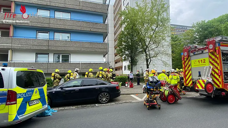 RATINGEN (DEUTSCHLAND): Bei dem Großeinsatz an der Berliner Straße in Ratingen-West wurden am 11. Mai 2023 sieben Einsatzkräfte der Feuerwehr und des Rettungsdienstes sowie zwei Polizeibeamte schwer, zum Teil lebensgefährlich verletzt. Eine weitere Person wurde schwer und eine leicht verletzt. Während des anschließenden Polizeieinsatzes wurde eine tote Person in der Wohnung gefunden. Eine größere Anzahl von Polizeibeamten erlitt Rauchgasvergiftungen.
