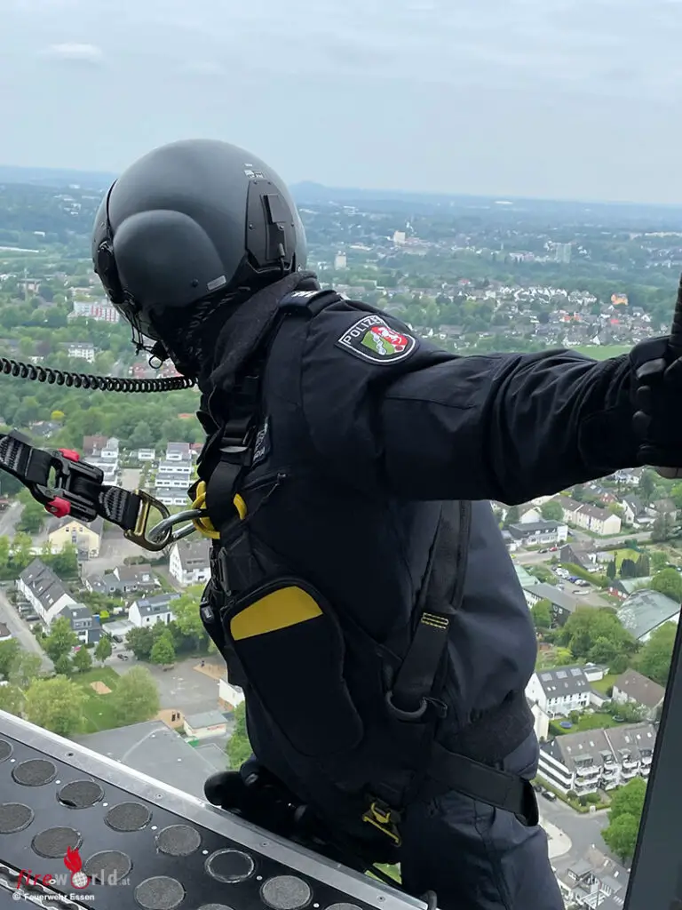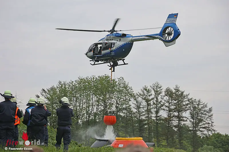 Ein besonderes Highlight war die Beteiligung der Hubschrauber-Fliegerstaffel der Polizei NRW an der Übung. Anders als bei Übungen, bei denen es auf Geschwindigkeit ankommt, lag hier der Schwerpunkt auf der Erprobung, der von der Feuerwehr Essen angeschafften Technik zur Wald- und Vegetationsbrandbekämpfung.