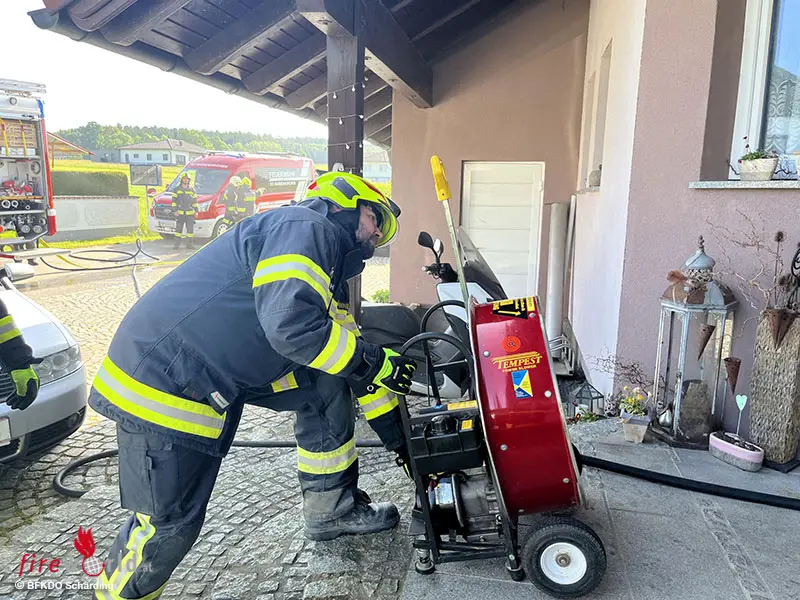 Am Einsatzort stellte sich für den Einsatzleiter folgende Lage, in einem Einfamilienhaus war in einem Raum im Erdgeschoss ein Brand ausgebrochen und das gesamte Stiegenhaus, sowie die Gänge waren stark verraucht. Die im Haus noch befindliche Tochter, konnte sich in einen Raum im Obergeschoss in Sicherheit bringen. Hierbei reagierte Sie vorbildlich um den Raum rauchfrei zu halten, verschloss Sie die Tür mittels Polster und Decken von innen.
