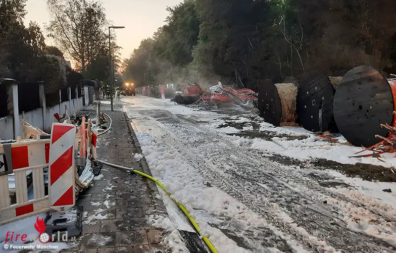 Eine Anruferin meldete um 02.23 Uhr der Integrierten Leitstelle brennende Kabeltrommeln auf einer Baustelle. Daraufhin wurde ein Hilfeleistungslöschfahrzeug alarmiert. Bereits auf der Anfahrt konnten die Einsatzkräfte einen gewaltigen Feuerschein erkennen und forderten weitere Kräfte nach.