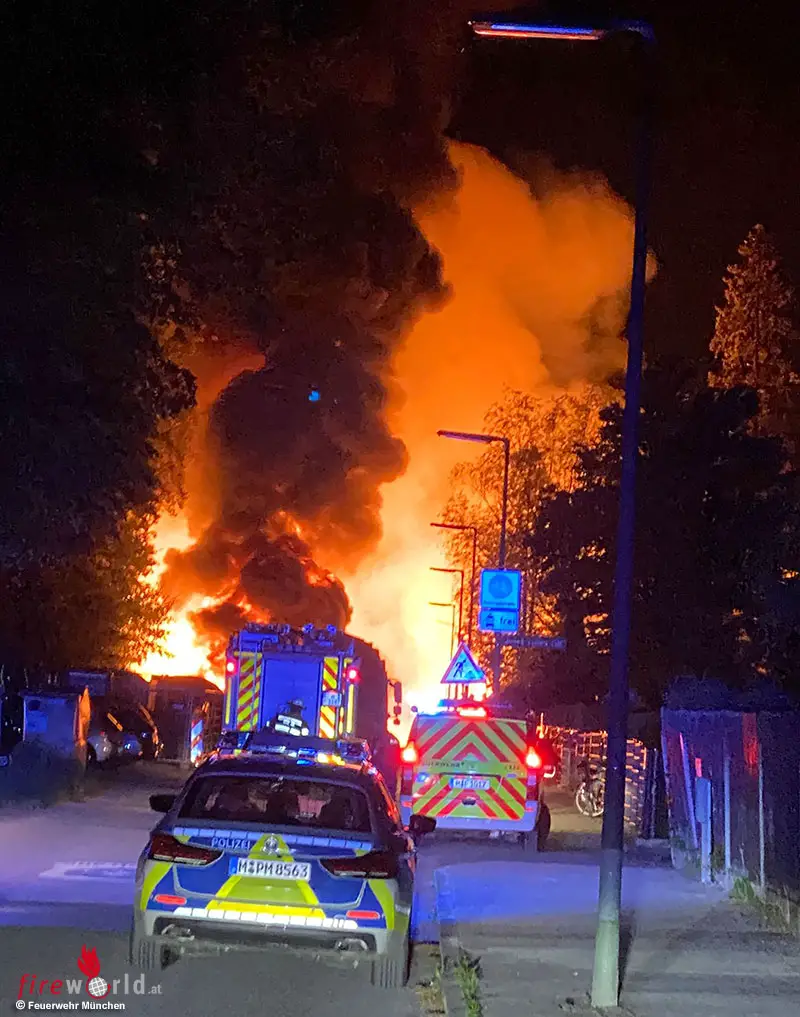 MÜNCHEN (BAYERN): Ein Großfeuer auf einer Baustelle hat die Feuerwehr in der Nacht auf den 26. Mai 2023 in der Bozzarisstraße in München in Atem gehalten. Es entstand ein enormer Sachschaden.