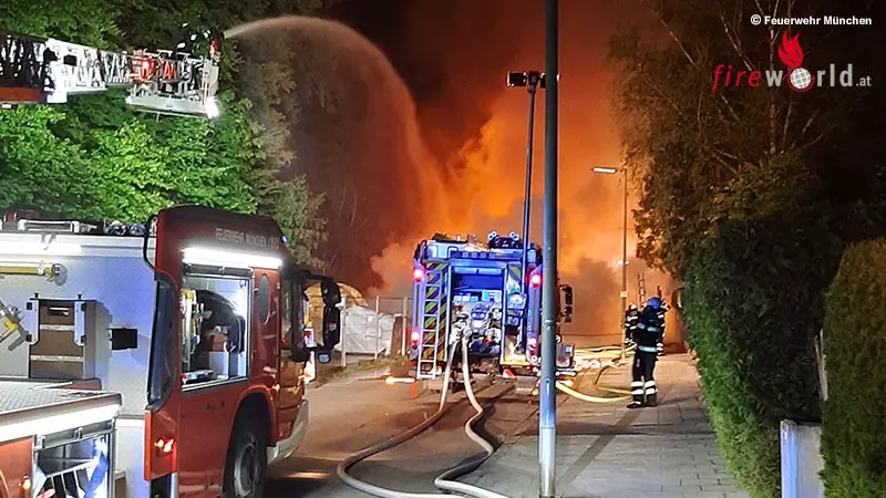 MÜNCHEN (BAYERN): Ein Großfeuer auf einer Baustelle hat die Feuerwehr in der Nacht auf den 26. Mai 2023 in der Bozzarisstraße in München in Atem gehalten. Es entstand ein enormer Sachschaden.