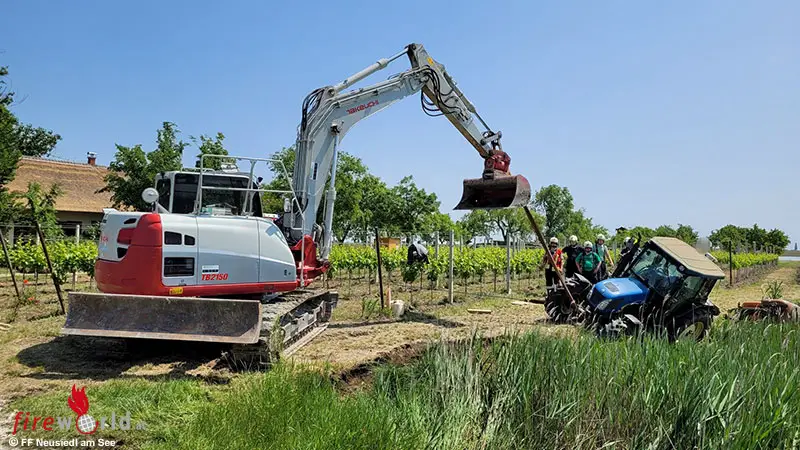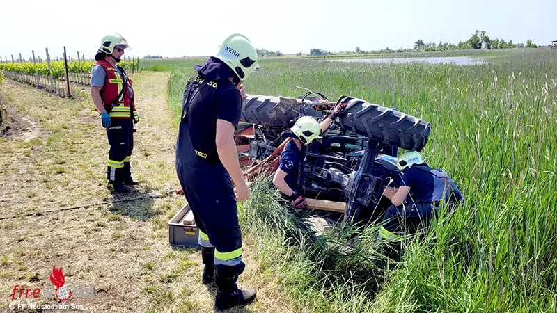 Der Traktor kam vom befestigten Untergrund ab und kippte seitlich über eine Böschung in ein Schilffeld. Verletzt wurde glücklicherweise niemand. Aufgrund der schwierigen Endlage des Traktors wurde vom Einsatzleiter die FF Neusiedl am See mit dem Schweren Rüstfahrzeug (SRF) mit Kran nachalarmiert.