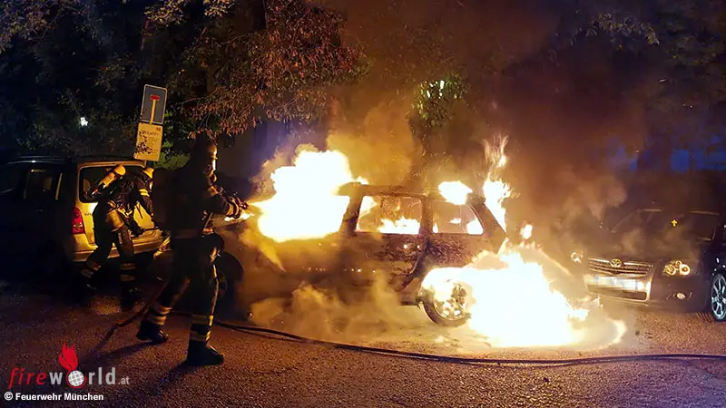 MÜNCHEN (BAYERN): Ein 20 Jahre alter Peugeot ist gegen 03.30 Uhr des 14. Juni 2023 bei einem Brand komplett zerstört worden. Die Feuerwehr konnte ein Übergreifen auf weitere Fahrzeuge gerade noch verhindern.