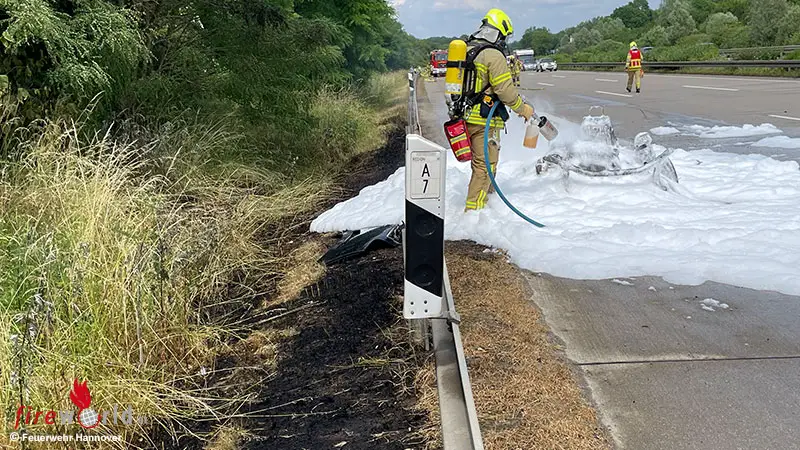 HANNOVER (DEUTSCHLAND): Am Montagmittag, 19. Juni 2023, ging die Meldung zu einem Pkw-Brand mit Gastank auf der BAB 7 stadtauswärts in Richtung Laatzen – auf Höhe der Raststätte Wülferode West – in der Regionsleitstelle ein. Als die Brandschützer aus Hannnover nach wenigen Minuten eintrafen, brannte der Pkw bereits großflächig. Nach rund dreißig Minuten hatten die Einsatzkräfte das Feuer unter Kontrolle. Verletzt wurde niemand, bei Eintreffen der Brandschützer hatten die Insassen das Fahrzeug verlassen.