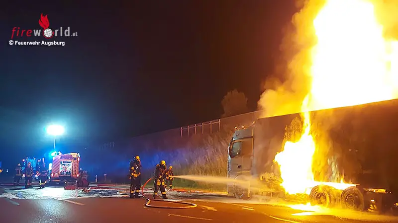 AUGSBURG (BAYERN): In der Nacht auf Mittwoch, 21. Juni, gegen 3:00 Uhr wurden die Einsatzkräfte der Berufsfeuerwehr Augsburg zu einem Lkw-Brand auf die BAB 8 Fahrtrichtung München zwischen den Anschlussstellen Augsburg West und Ost alarmiert.