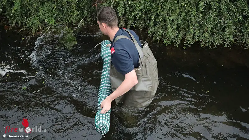 Begonnen hatte der schweißtreibende Abend mit einem Schadstoffeinsatz. Im Flatschacherbach trieb ein Ölfilm auf dem Wasser. Neben der Feuerwehr Flatschach wurde zusätzlich die Schadstoffeineinheit der Feuerwehr Knittelfeld alarmiert, die mehrere Ölsperren errichtete.