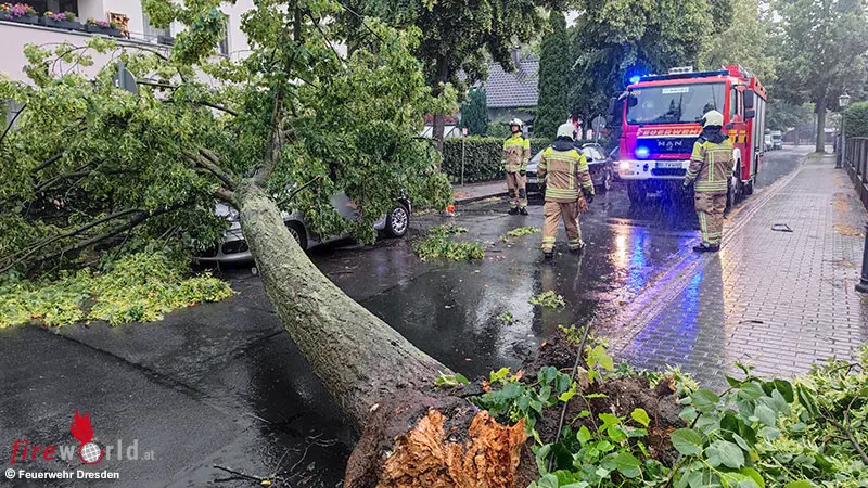 DRESDEN (DEUTSCHLAND): Passanten alarmierten um 18.29 Uhr des 26. Juni 2023 die Feuerwehr Dresden, weil ein Baum auf einen Pkw gefallen war, in dem sich noch Personen befinden sollten.