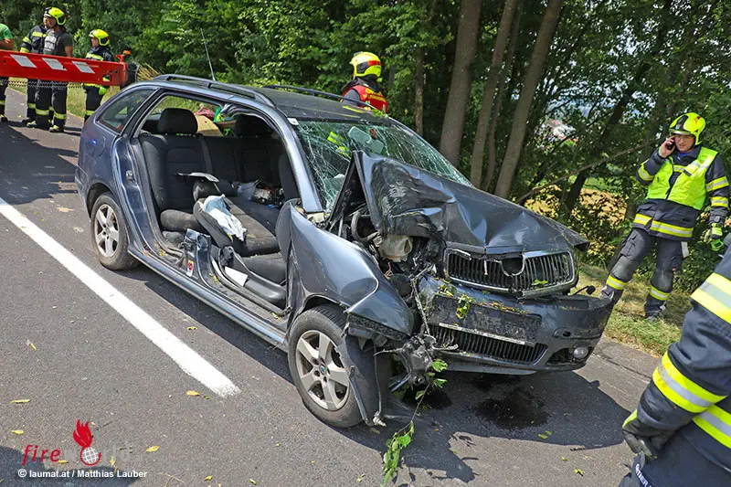RÜSTORF (OÖ): Eine Autolenkerin ist Freitagnachmittag, 30. Juni 2023, bei Rüstorf (Bezirk Vöcklabruck) mit ihrem Pkw von der Straße abgekommen und frontal gegen Bäume geprallt.